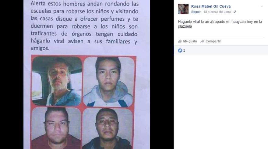 «El rumor de que un grupo de traficantes de órganos está raptando niños en varios distritos al este de Lima desató ayer el descontrol y la violencia en Huaycán, que dejaron una mujer fallecida y varios policías heridos.»
